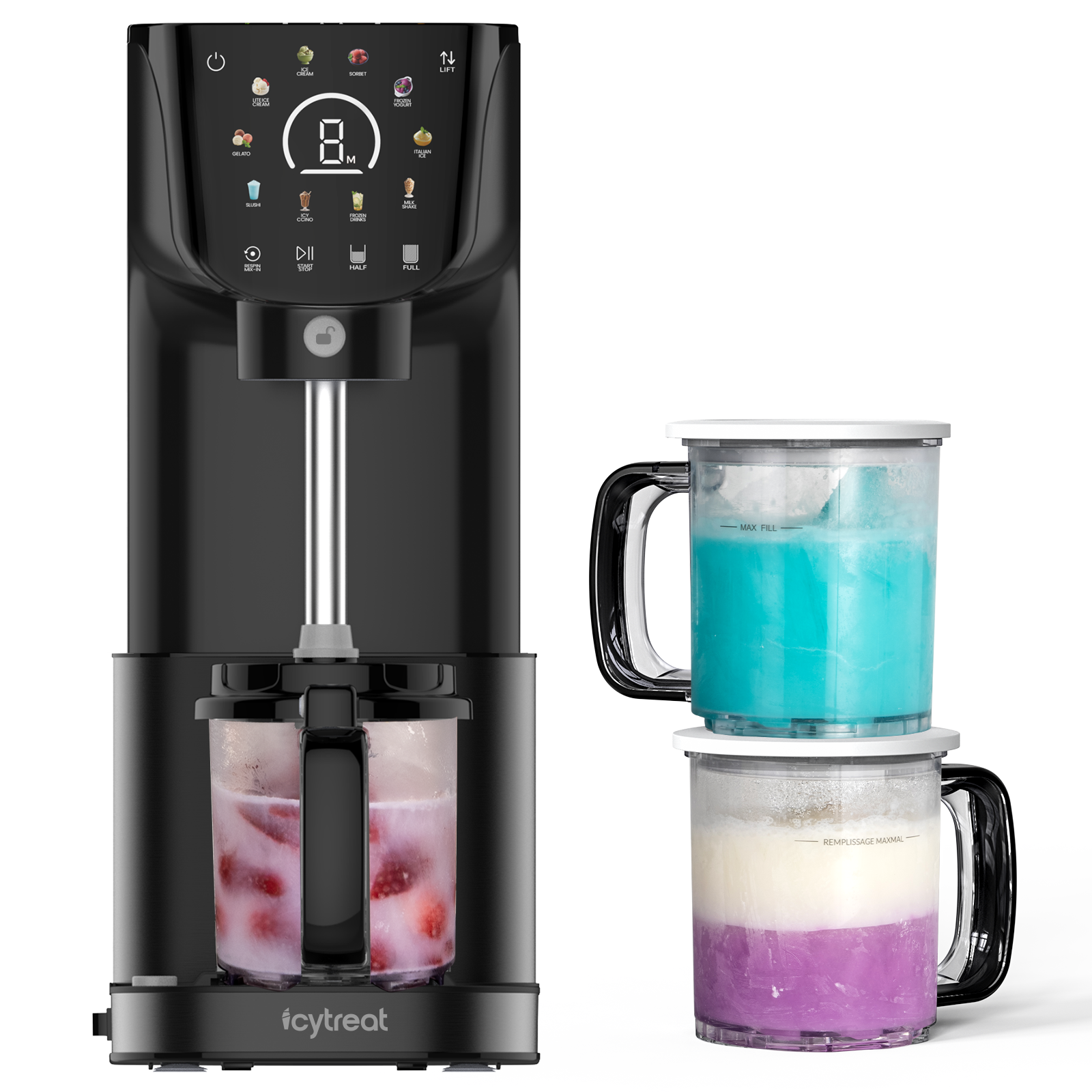 - Full & Half Cup Setting: Transform either a full or half portion of your frozen base, letting you create two different mix-in flavors from the same base.Re-Spin Function: To achieve a smoother texture, it’s suggested to use "RESPIN/MIXIN" program.