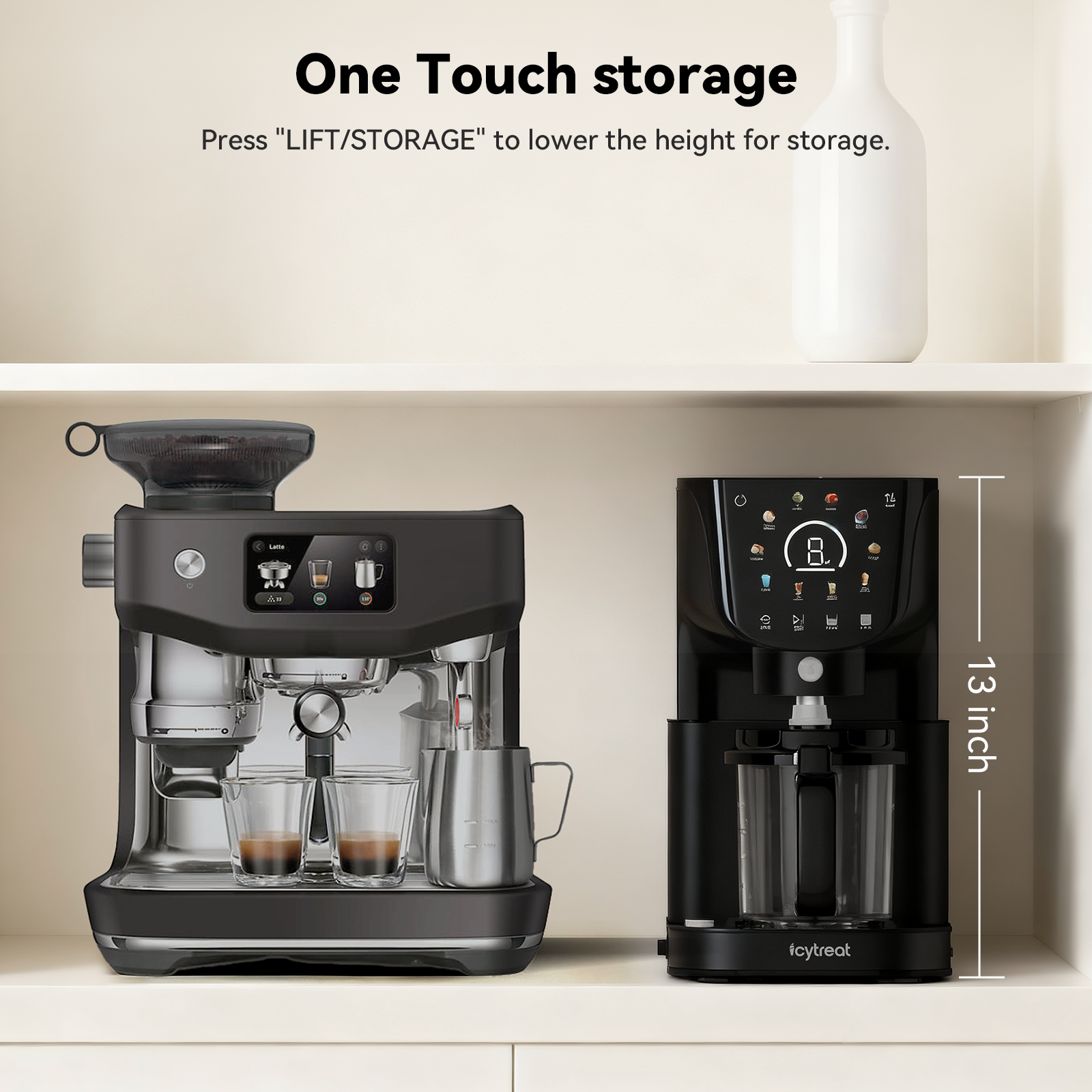 - One Touch Storage: Press "LIFT/STORAGE" to lower the height to 13 inch for storage. Space-saving design makes it easy to fit on your countertop or inside a cabinet.